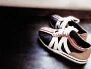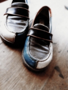 L'abri d'un cahier. Chaussures de brun et rouge.