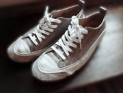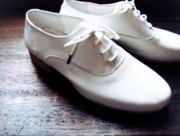 Chaussures blanches comme des chaussures de ballet un peu étranges. Chaussures pour être un peu plus heureux que les gens portent.